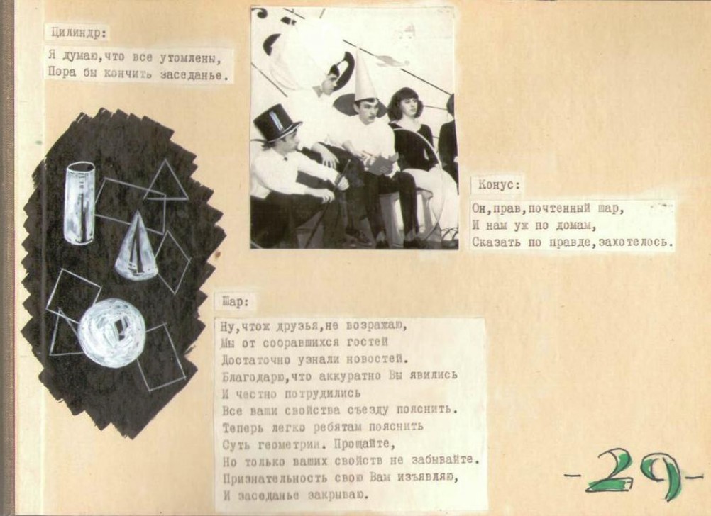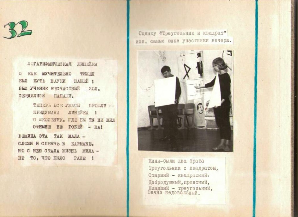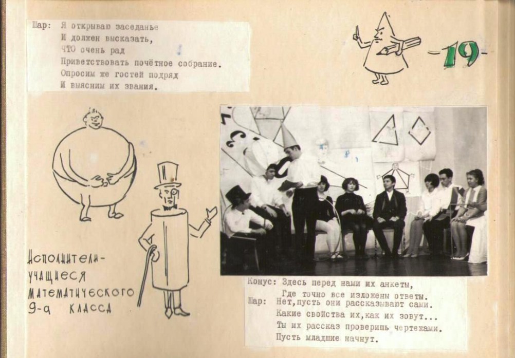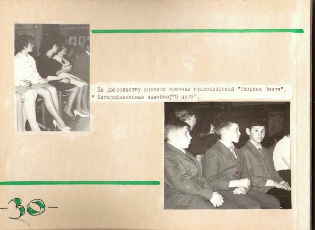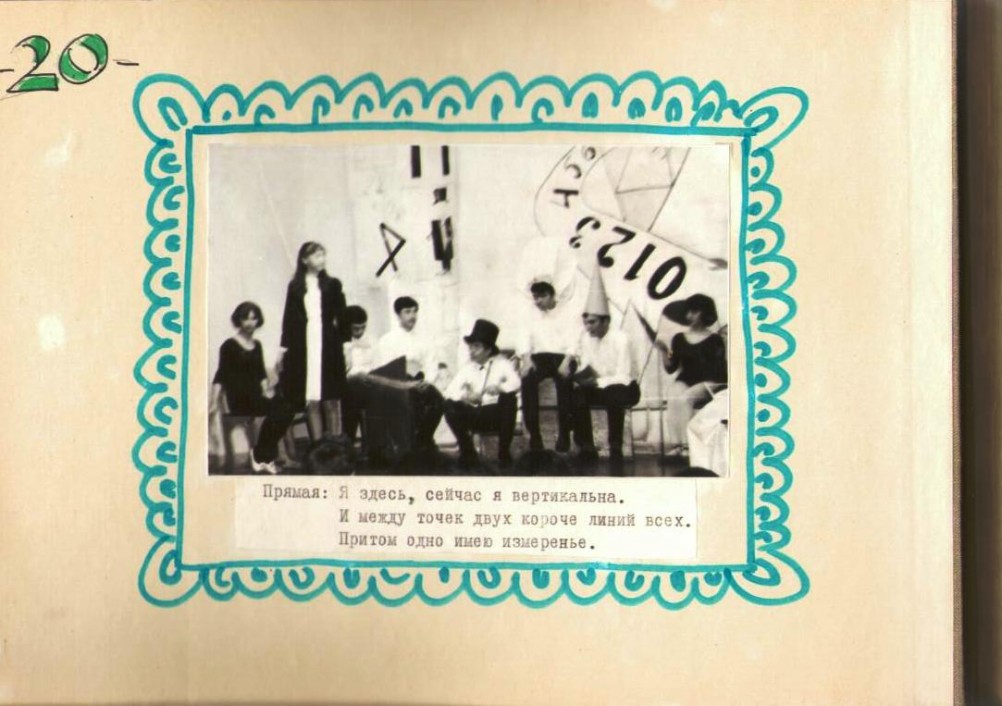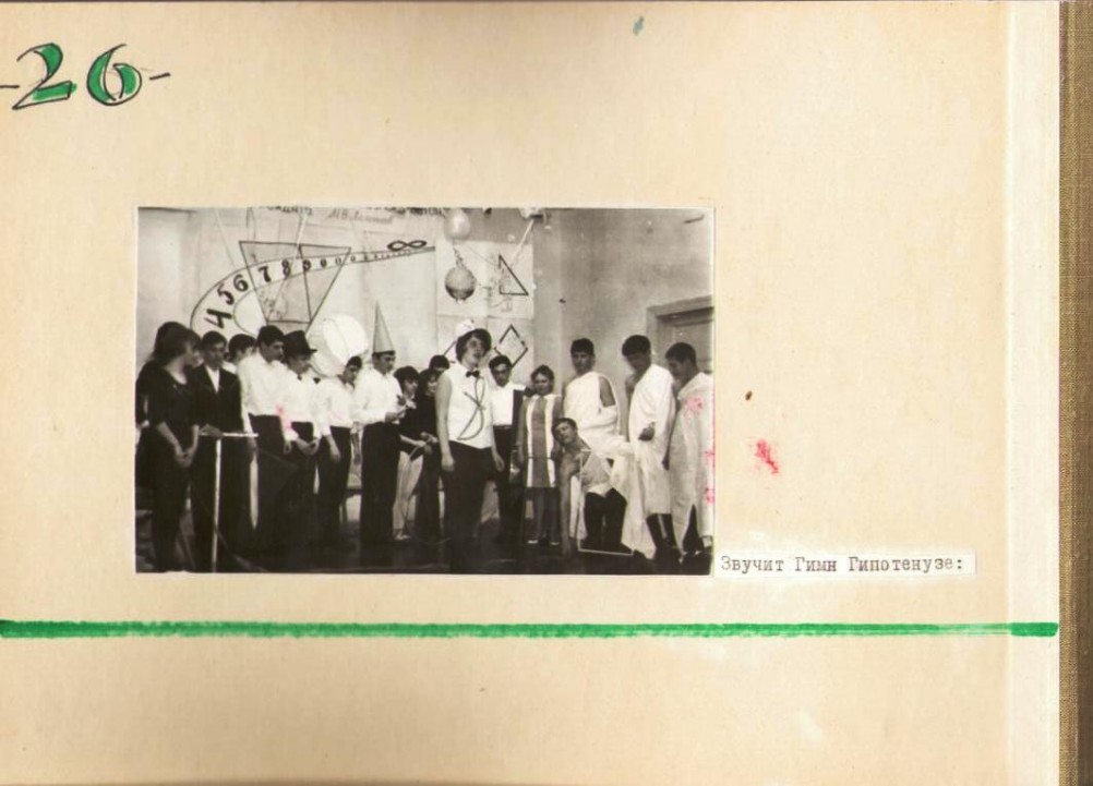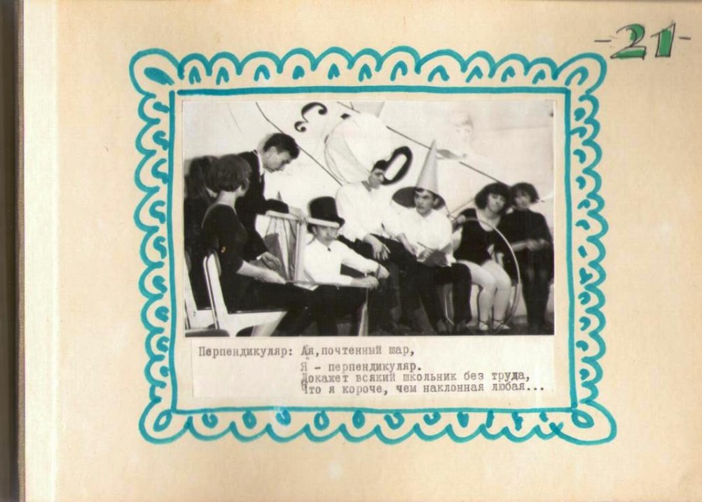 Это было так давно, что выпускники школы, участвовавшие в этом Математическом вечере уже не помнят его. Пришлось даже опознавать место - актовый зал 75-й школы и сравнивать некоторые детали с более поздними фотографиями. Так получилось, что на мой призыв пополнить коллекцию снимков выпусков наших школ откликнулись очень приятные в общении люди - бывшие выпускники школы №20 выпуска 1969 года Михаил Попов, Александр Субботин и Анна Африкьян (Куприц). Сразу три человека - рекордный показатель отзывчивости класса, а какой объём фотографий мне пришёл на почту уже в готовом виде! Я до сих пор ещё не успел все выложить на сайт. Настало время мне вернуть должок. В представляемом вашему вниманию альбоме как раз тот самый Математический вечер. Я очень рад, что теперь он может быть доступен им и всем нам на сайте для того, чтобы участники события вспомнили об этом эпизоде из своей школьной жизни, а мы просто порадовались за них и немного за себя. На сканах страниц альбома я даже оставлял чуть-чуть обратной стороны корешка, чтобы сохранить небольшое ощущение от просмотра настоящего альбома. Такие альбомы делались в единственном экземпляре.