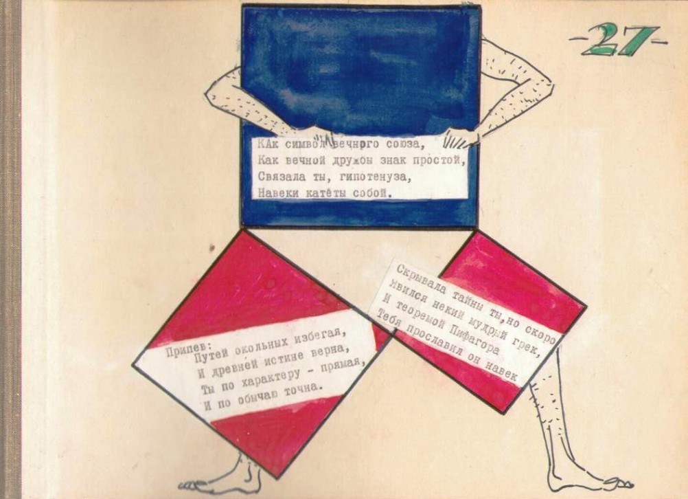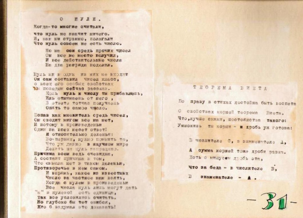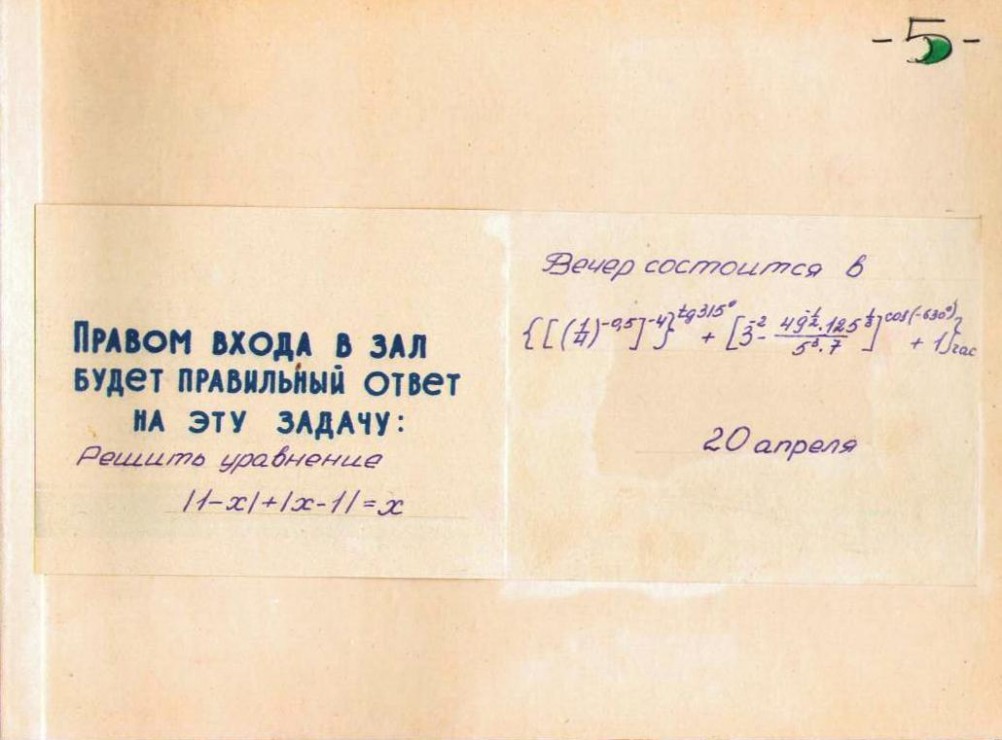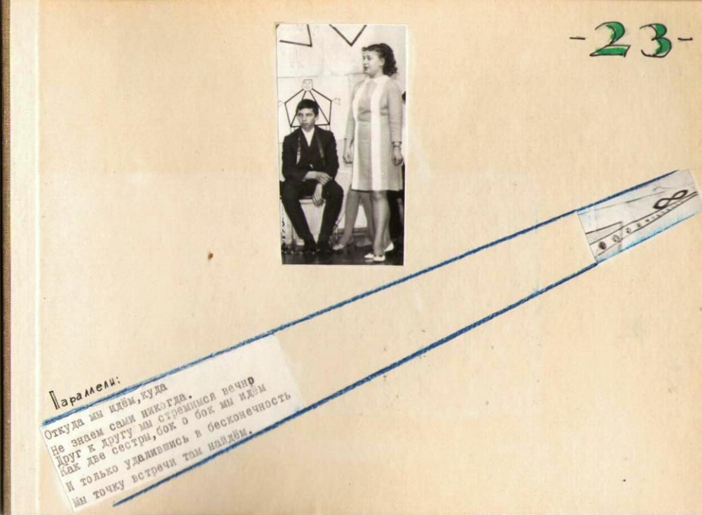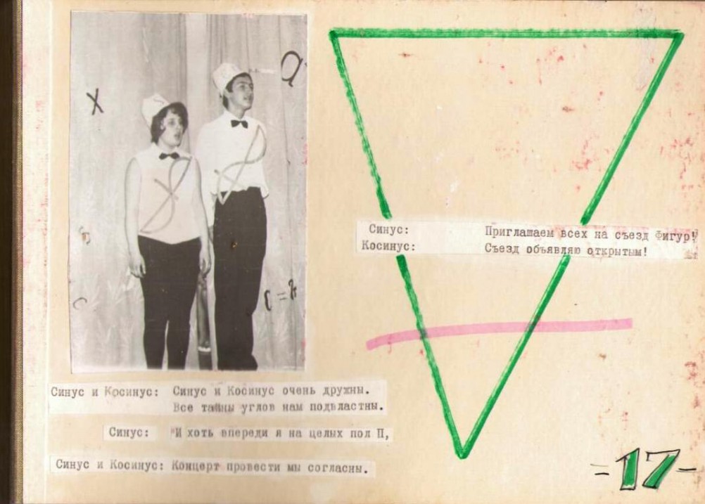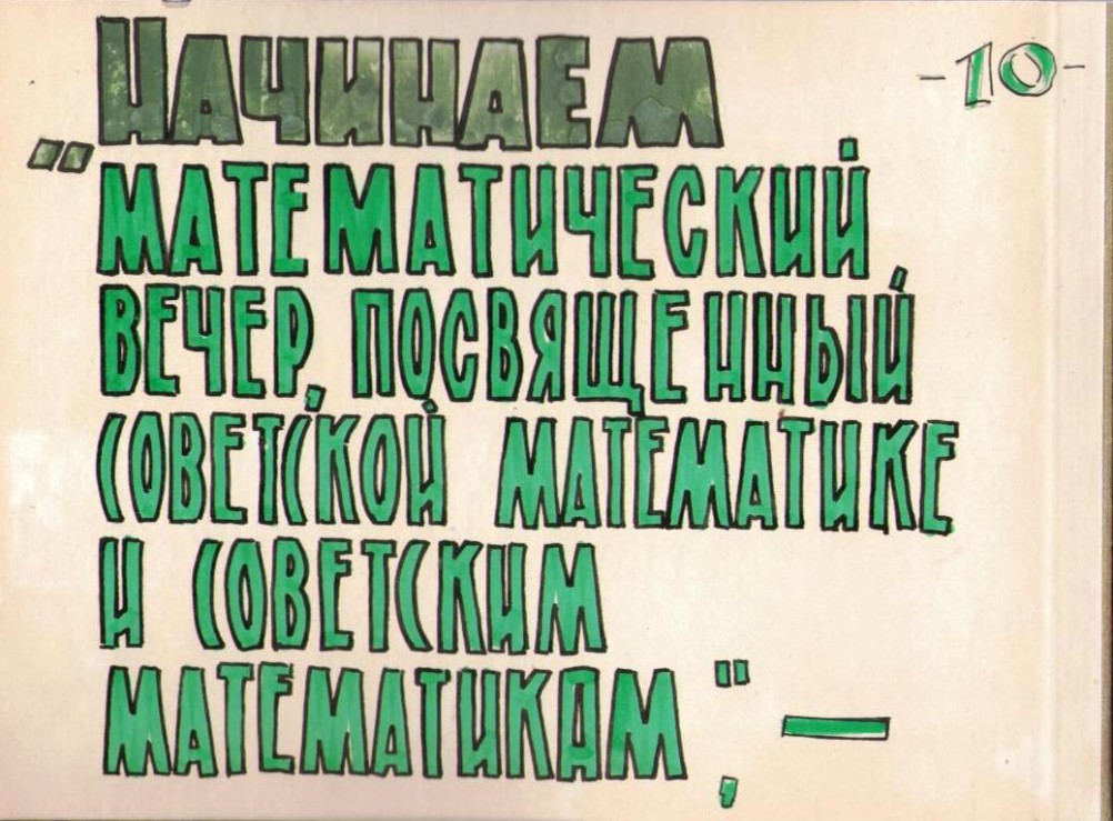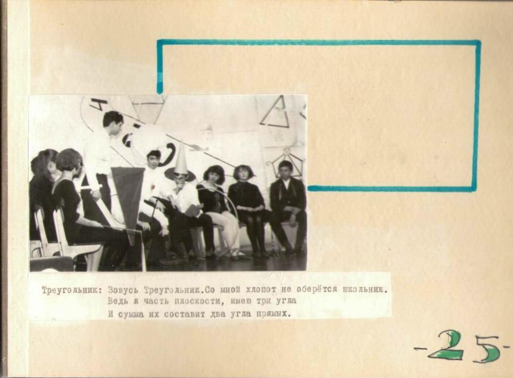 Это было так давно, что выпускники школы, участвовавшие в этом Математическом вечере уже не помнят его. Пришлось даже опознавать место - актовый зал 75-й школы и сравнивать некоторые детали с более поздними фотографиями. Так получилось, что на мой призыв пополнить коллекцию снимков выпусков наших школ откликнулись очень приятные в общении люди - бывшие выпускники школы №20 выпуска 1969 года Михаил Попов, Александр Субботин и Анна Африкьян (Куприц). Сразу три человека - рекордный показатель отзывчивости класса, а какой объём фотографий мне пришёл на почту уже в готовом виде! Я до сих пор ещё не успел все выложить на сайт. Настало время мне вернуть должок. В представляемом вашему вниманию альбоме как раз тот самый Математический вечер. Я очень рад, что теперь он может быть доступен им и всем нам на сайте для того, чтобы участники события вспомнили об этом эпизоде из своей школьной жизни, а мы просто порадовались за них и немного за себя. На сканах страниц альбома я даже оставлял чуть-чуть обратной стороны корешка, чтобы сохранить небольшое ощущение от просмотра настоящего альбома. Такие альбомы делались в единственном экземпляре.
