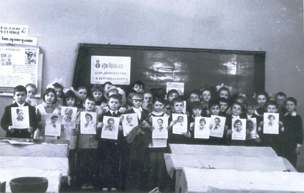 2 «Б» класс (7 февраля 1976 года). 8 февраля отмечался (и сейчас есть такой праздник) «День юного героя-антифашиста». Мы серьёзно готовились к этому празднику: изучали биографии пионеров-героев (их фотографии можно увидеть сзади нас на классной доске); ставили небольшую постановку, посвящённую юным героям-антифашистам (о чём говорит реквизит в наших руках). Одним словом, это был для детей день мужества и патриотизма.