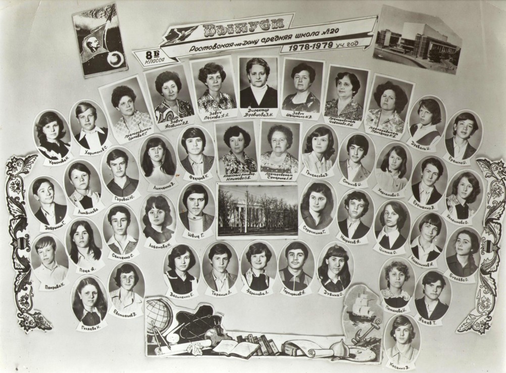 Теория шести рукопожатий для Сельмаша не подходит, шесть – это слишком много. В условиях, когда два из трёх жителей нашего района прошли через Школу – гигант, достаточно максимум второго рукопожатия, чтобы убедиться в том, что раз не в этой, значит в той части школы прошли годы детства, а значит и пути-дорожки пролегали где-то рядом с тем, кому эту руку жмёшь. Разглядывая эту фотографию, я задался целью найти знакомое лицо среди учеников – выпускников 8-го класса 1979 года. Всё оказалось просто – есть и здесь такое лицо. Уникальный, таки, наш район, уникальный!