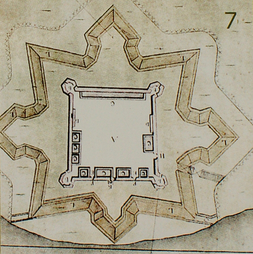 Саня, у тебя со зрением все хорошо? Видишь слева и справа от башни стены, каждая из которых образует входящий угол с наружной стороны крепости, и исходящий угол - с внутренней. Исходящие углы - это и есть 7 и 8 грани. Научитесь читать чертежи, а потом спорьте с подьячим, который описывал только что сдавшуюся крепость в 1696 г. и все видел своими глазами!