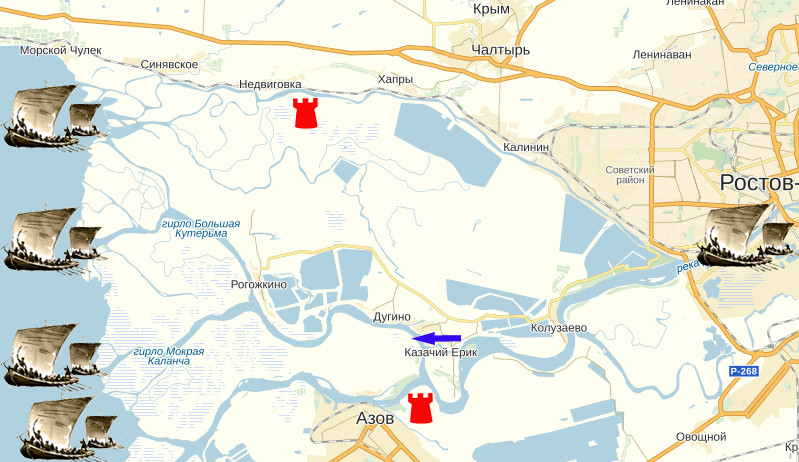 Вспомним историю. В 1642 году заканчивается легендарное Азовское сидение, казаки, не получившие поддержки от России, оставляют Азов и отходят в свои городки в Раздоры и на Махин остров. Турки укрепляют Азовскую крепость и, дабы не повторить ошибку, стараются полностью преградить казакам выход в Азовское море. Надо сказать, что в 17-м веке основным промыслом казаков был тривиальный морской разбой в Азовском и Каспйском морях. В Азовское море казачьи чайки попадали по основному руслу Дона, а также через гирло Мокрая Каланча, Большая Кутерьма и через Мертвый Донец. Турки строят две каланчи с пушками выше Азова, перекрывшие и основное русло Дона, и выходы в оба гирла, и крепость Лютик на Мертвом Донце,таким образом полностью запечатав выход в море. Казаки, безуспешно попытавшись пару раз штурмом взять Лютик, оставили эту мысль и прорыли «казачий ерик» (синяя стрелочка), через который попадали в Азовское море, минуя турецкие укрепления. Надо еще добавить, что длилась эта великая битва между Россией и Аттаманской Портой за обладанием Приазовьем почти полтора века.