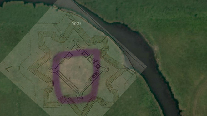 Игорь помог во всем разобраться. При наложении контуров крепости на план археологов почти точно совпадают угловые башни. Плюс-минус допуски на неточность древнего рисунка. Тогда, приблизительно, вот так крепость стояла, см. рис.