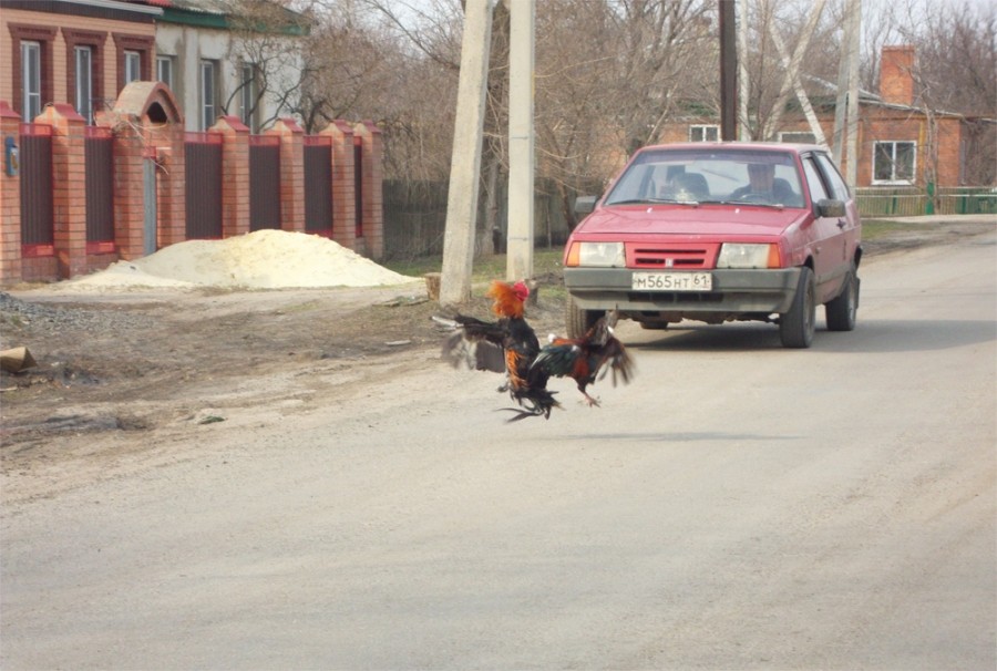 И петушиным боем. На одной из улиц заметил двух приготовившихся к бою бойцов.