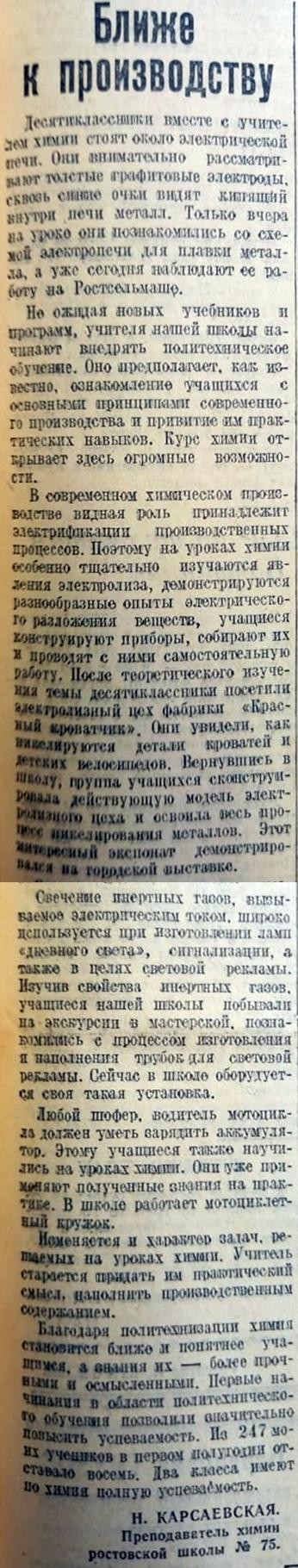 Не менее интересную находку обнаружил Александр Игрунов в подшивке газеты "Молот" от 7 февраля 1953 года - статью классного руководителя этого выпуска и учителя химии Карсаевской Натальи Михайловны.