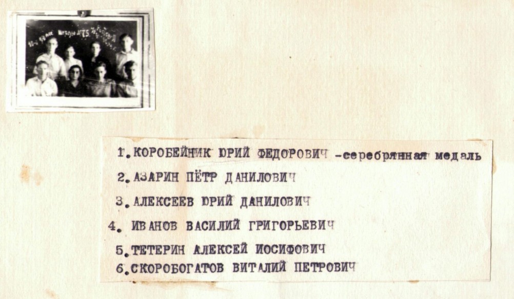 Выпускников было шестеро - фамилии всех указаны в альбоме истории школы. Всего шесть юношей - выпускников для такой большой мужской школы - это, конечно, невероятно мало, но в младших классах в ту пору учеников уже было предостаточно. Вспомним последний выпуск мужской школы 1955 года - 124 выпускника - рост за восемь лет более чем в 20 раз! На маленькой копии фотографии заметна надпись "10-й класс школы №75".