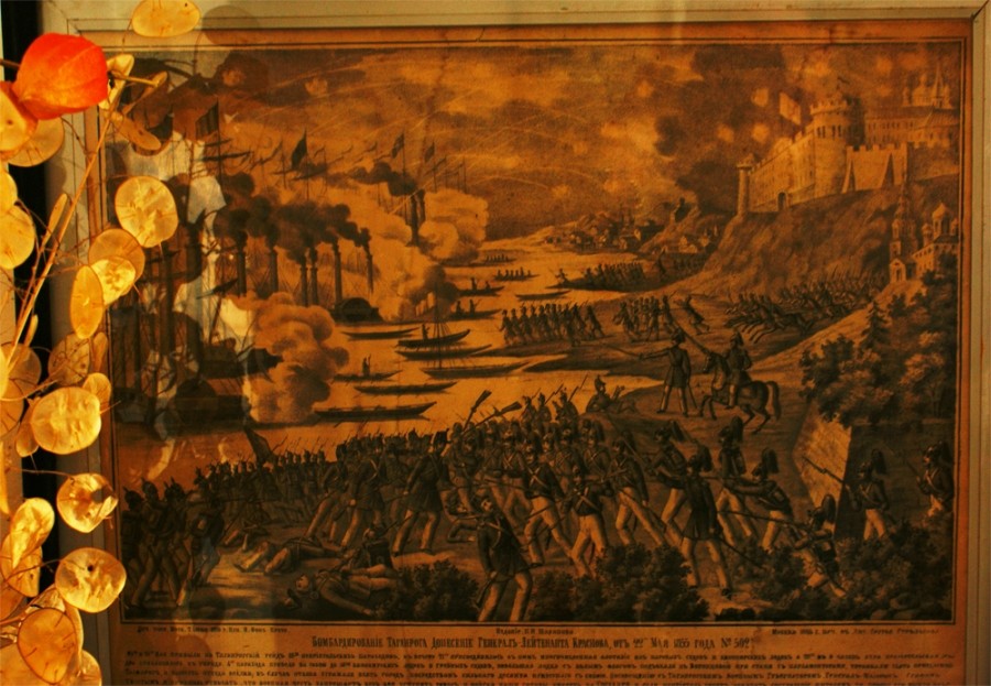 А эта картинка висит в Таганроге в доме-музее А.П. Чехова. Есть какое-то наивное очарование в лубочных картинках 19-го века. Троицкая крепость изображена в виде средневекового замка с каменными зубчатыми стенами и башнями. Хотя в реальности, как и все крепости в нашем крае, она была системой земляных валов. Англо-французская эскадра дымит сотнями труб и выпускает по крепости сотни ядер. На берегу идет битва защитников крепости с десантом, больше похожая на торжественный смотр войск.