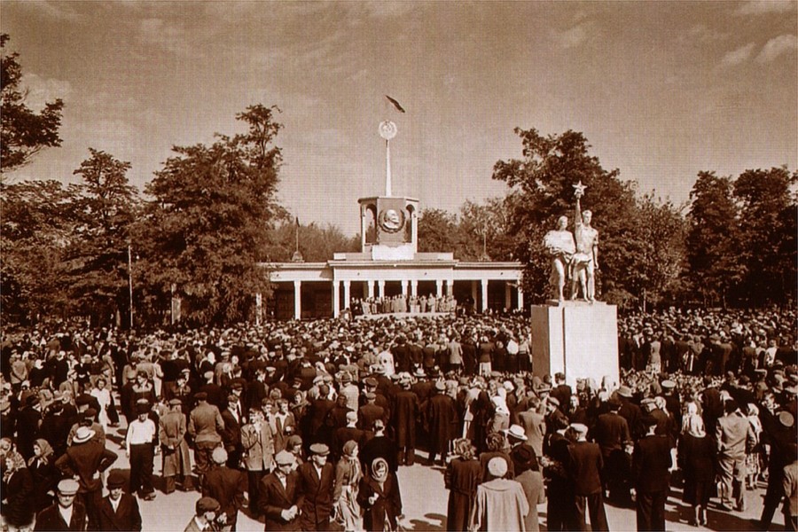 Очень интересная подборка фотографий сельскохозяйственной выставки, которая существовала с 1955 года (это точно, проверено по СМИ) по, примерно, середину 1960-х годов. А потом еще несколько лет городок из павильонов выставки (часть их них была деревянными) использовалась для торговой ярмарки. Для чего сейчас используются домики справа от главной аллеи - не знаю, но, во всяком случае, не для конторы парка (которая прекрасно устроилась уже давно в бывшей станции "Победа" ДЖД (после того, как построили новую главную станцию ДЖД - "Солнечная"). Пацаном-школьником я не раз был на этих выставках-ярмарках - сначала с родителями, а потом и сам. Продукция "Ростсельмаша" и "Красного Аксая" - как предприятий сельхозмашиностроения - обязательно была представлена на выставке, даже когда она была чисто сельскохозяйственной. А тем более когда она стала промышленной и сельскохозяйственной. Народ валом валил на выставку - это тоже помню. Спортивные залы на этой территории построены позднее, хотя, возможно, с частичным использованием перестроенных павильонов выставки. Судьба скульптуры у входа мне неизвестна, но, конечно, она была сделана из недолговечных материалов...