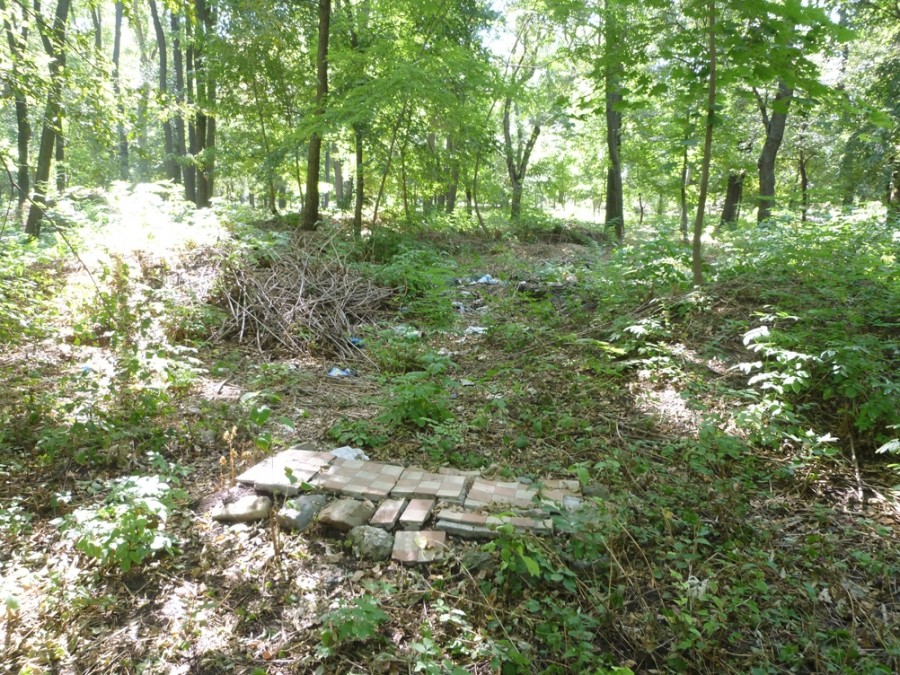 И только маленькая развалившаяся площадка, покрытая метлахской плиткой говорит о том, что на этом месте было капитальное строение.