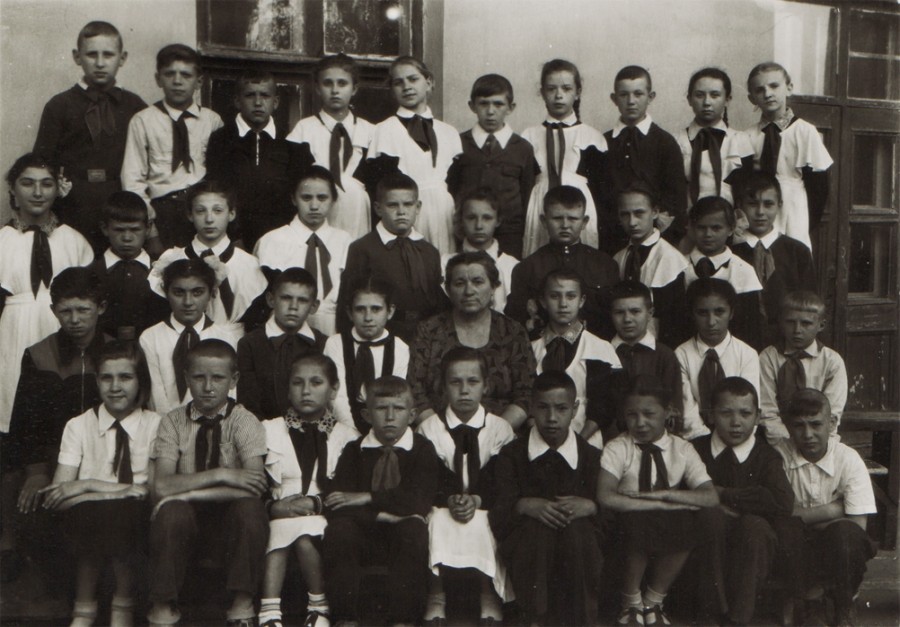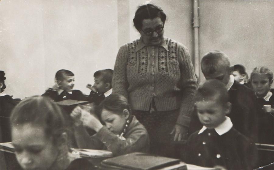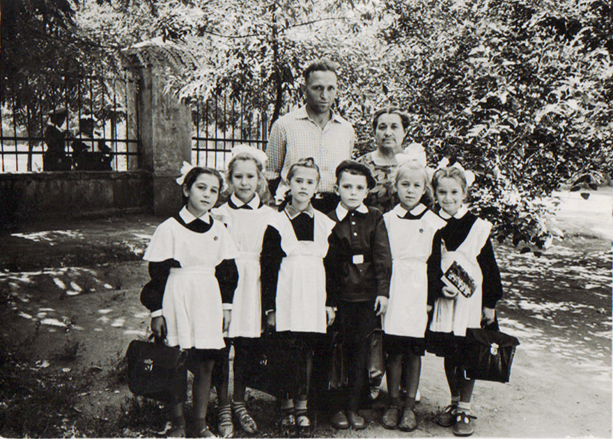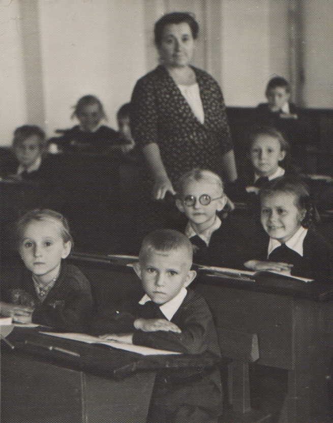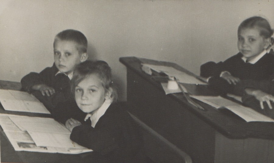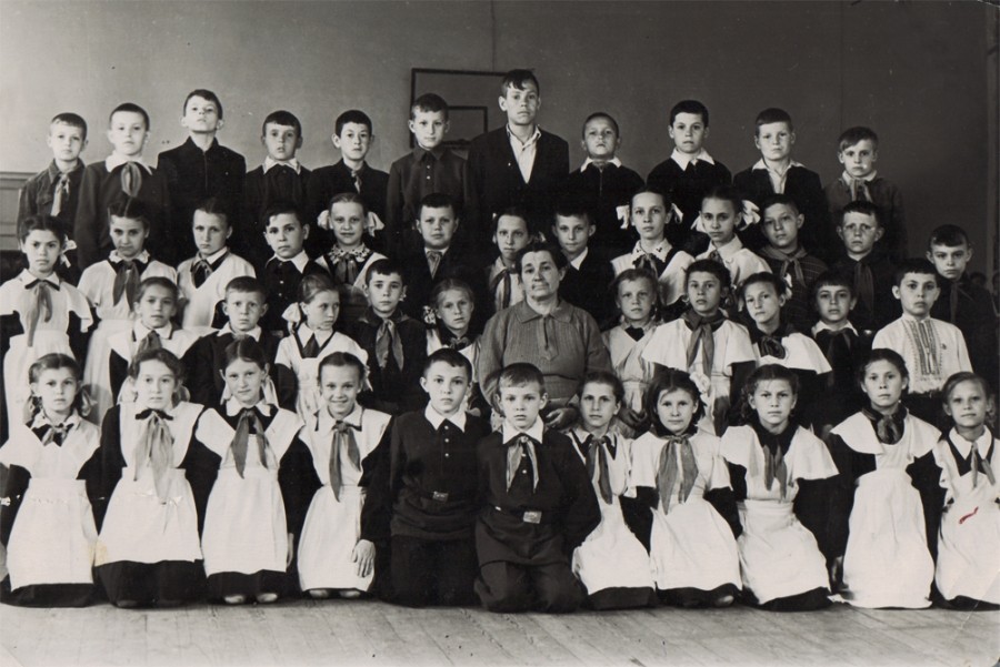Ростовская средняя школа № 75. Рубеж 50,60-х. Знаю, что фотографировал любитель, но фото получилось очень выразительным, ярким и непосредственным. Пожилая учительница – моя бабушка. Первоклассники, руки сложены одна на другую, белые воротнички и открытые тетрадки. Парты с желобками для карандашей и тяжелыми откидными крышками, если такую с силой откинуть, можно было оглохнуть. Теплое и немного грустное фото.