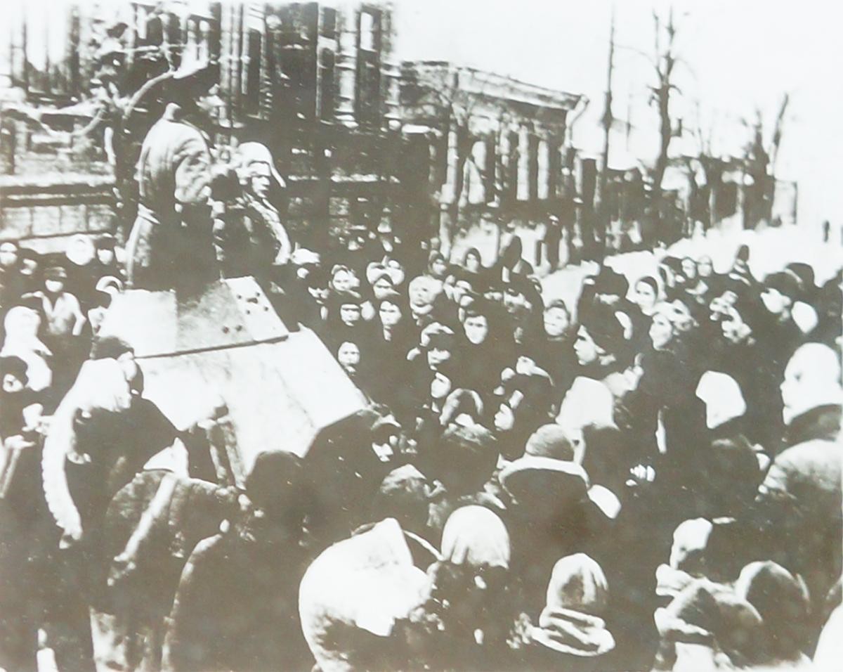 На первом митинг на улицах Ростова 14 февраля 1943 года, в день освобождения города от немецко-фашистских захватчиков. На броневике заместитель председателя ростовского горисполкома, капитан 5-го гвардейского донского кавкорпуса, С.Р. Бурменский.