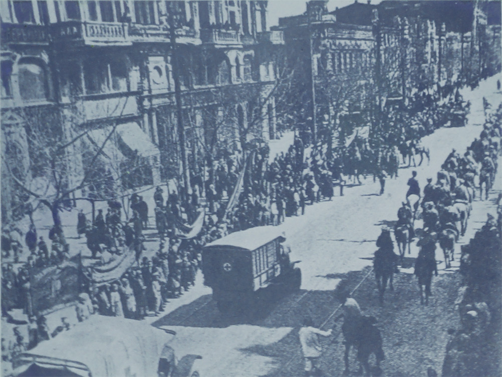 На втором фото проводы частей Первой Конной армии на польский фронт. Ростов-на-Дону. Весна 1920 г. Понять бы, почему колонна конников и машин движется на восток, когда Польша, как известно, на западе. Да не узнаем уже. Печально, но зная историю польского похода, легко предположить, что многие из конармейцев на этом фото видели Ростов в последний раз. Мне кажется, что у нестройной конной колонны печальный вид. Или фантазирую.