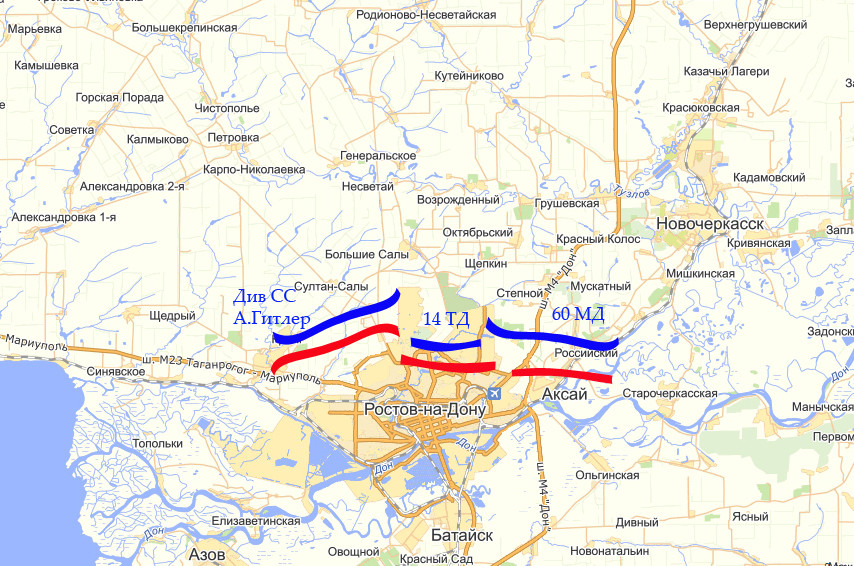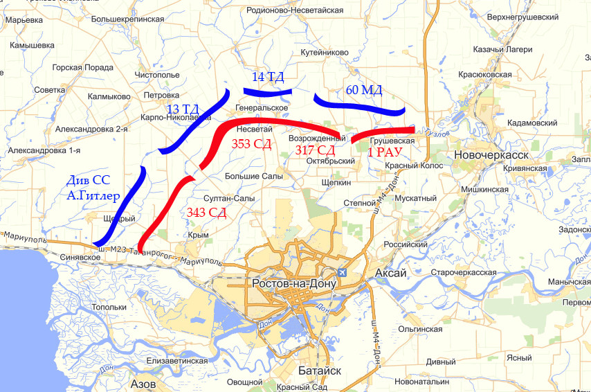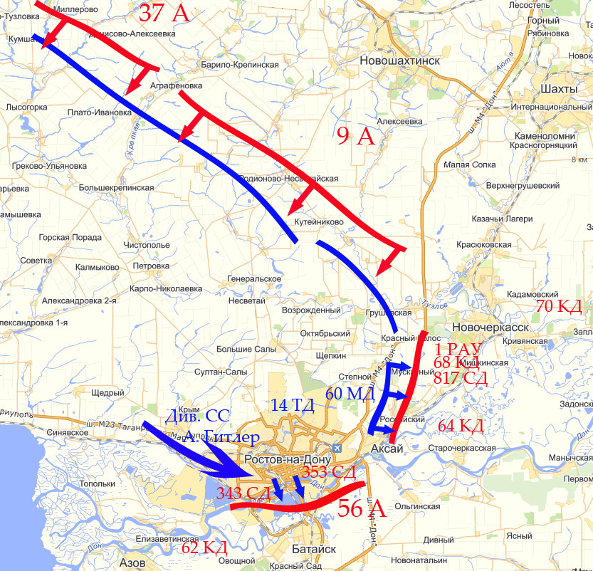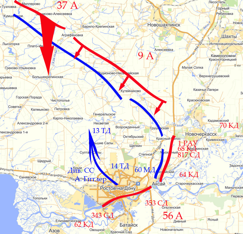 На участок обороны дивизии СС «Адольф Гитлер»(от центра Ростова-на-Дону до Чалтыря по берегу Дона и Мёртвого Донца) 27-28 ноября 1941 года наступали 31-я и 343-я стрелковые и 62-я кавалерийская дивизии, а также 13-я и 78-я стрелковые бригады 56-й армии.
