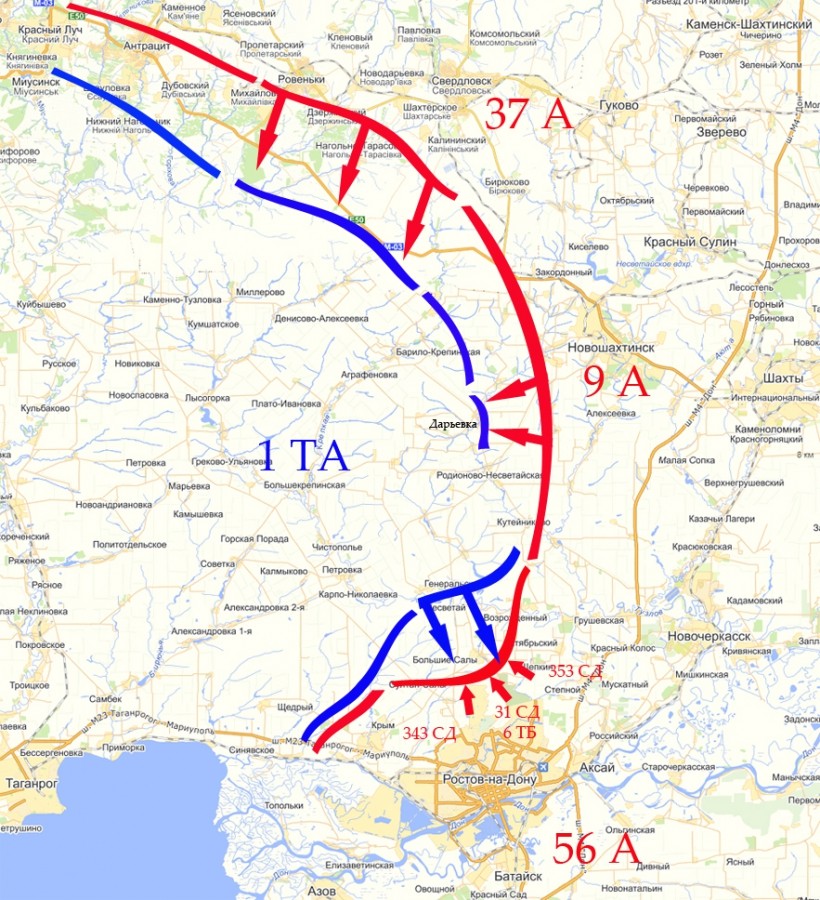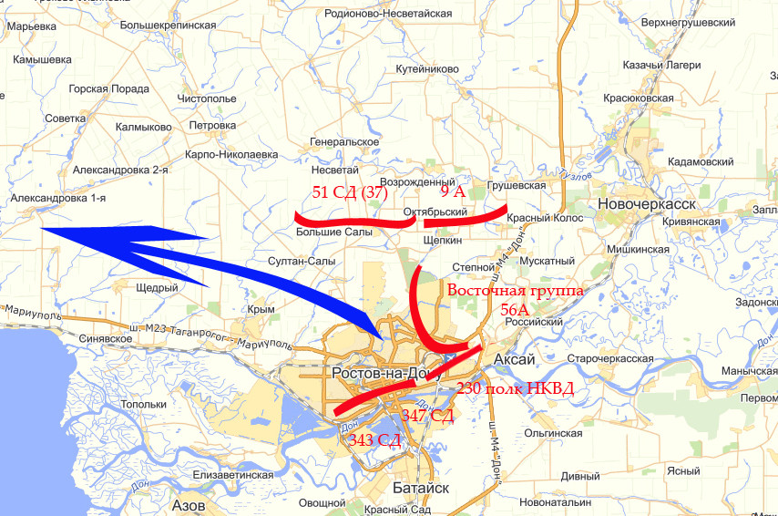 Левее 353-й сд от ст. Ольгинской наступала 16-й отдельная стрелковая бригада, а полевому краю от 16-й осбр на Нахичевань наступала 347-я стрелковая дивизия. (Боевое распоряжение штабрига 16-й осбр от 29.11.1941 г.) – В.Щ.)