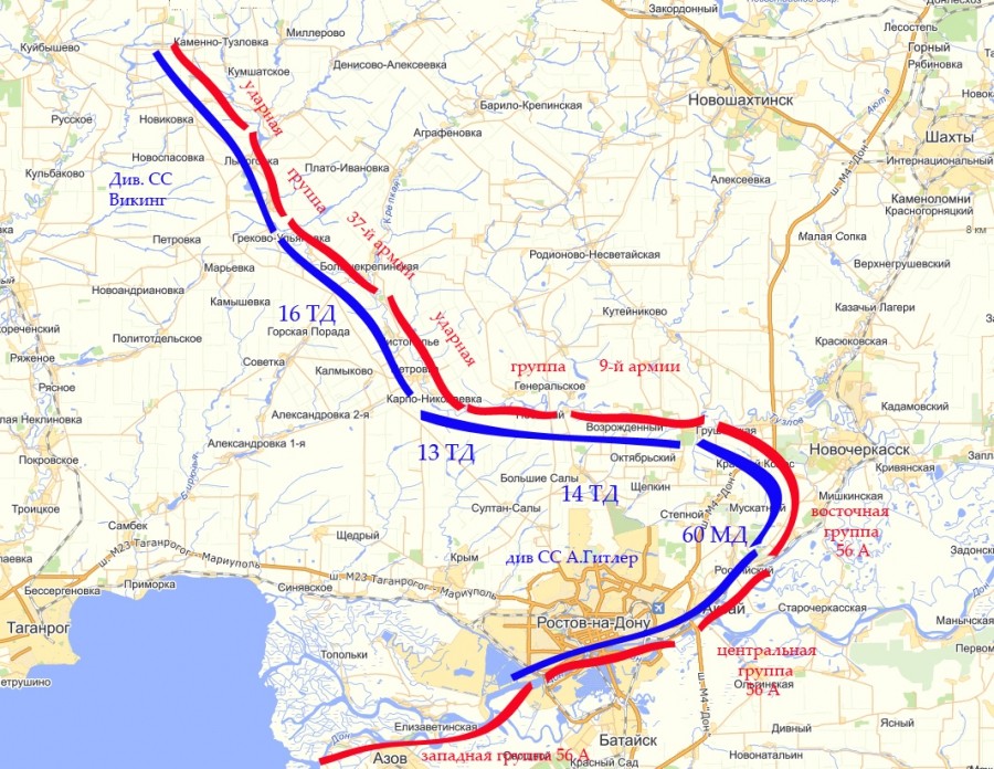 Началась Ростовская операция 17 ноября 1941 года. Общая расстановка сил на тот день была следующая: Войскам нашего Южного фронта, (командующий генерал полковник Черевиченко) противостояла Первая танковая армия вермахта, (командующий генерал полковник Клейст). Ударная групировка немцев, состоящая из дивизии СС «Адольф Гитлер», 13 и 14-й танковых дивизий и 60 мотострелковой дивизии, готовила наступление на Ростов. Наши ударные группировки ; 37 армии, сосредоточенная в районе Каменска и 9-й армии, сосредоточенная в районе Шахт (здесь и далее, я даю современные названия населенных пунктов), готовили наступление на Таганрог, захваченный немцами еще 17 октября.