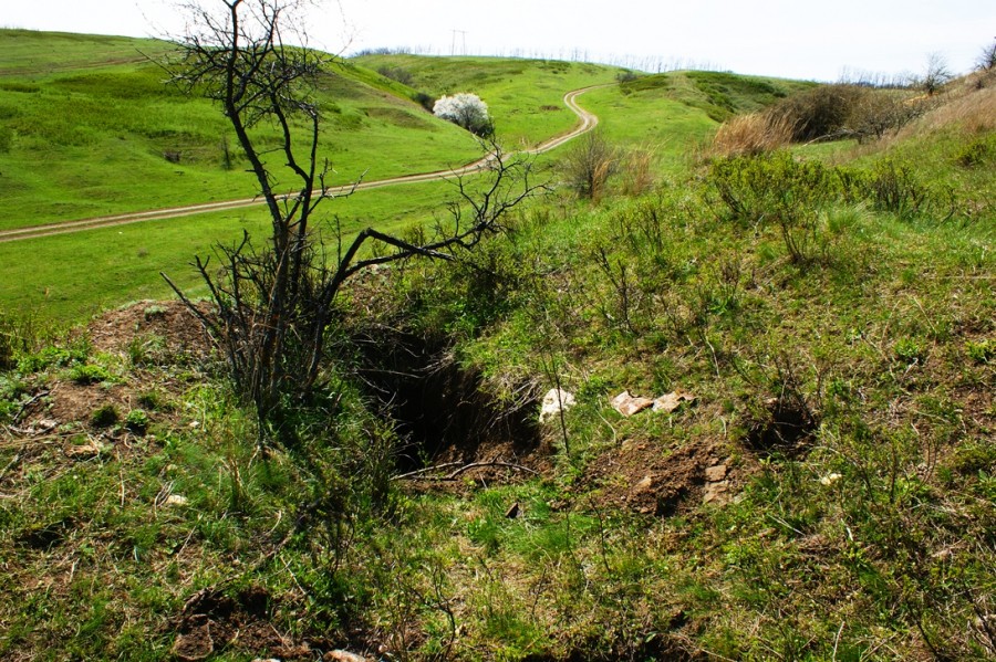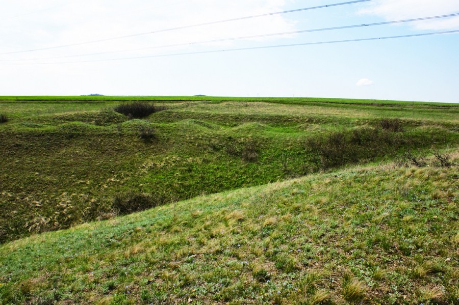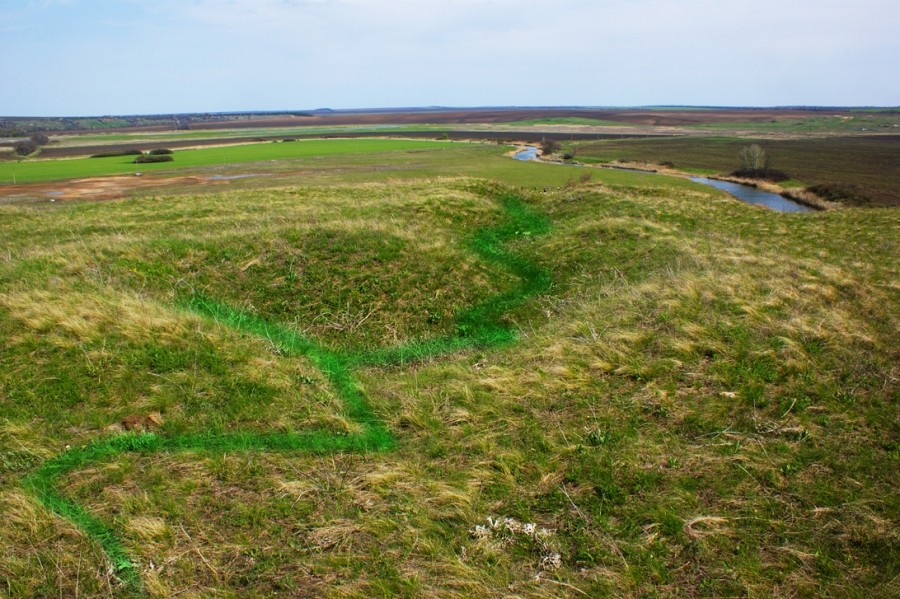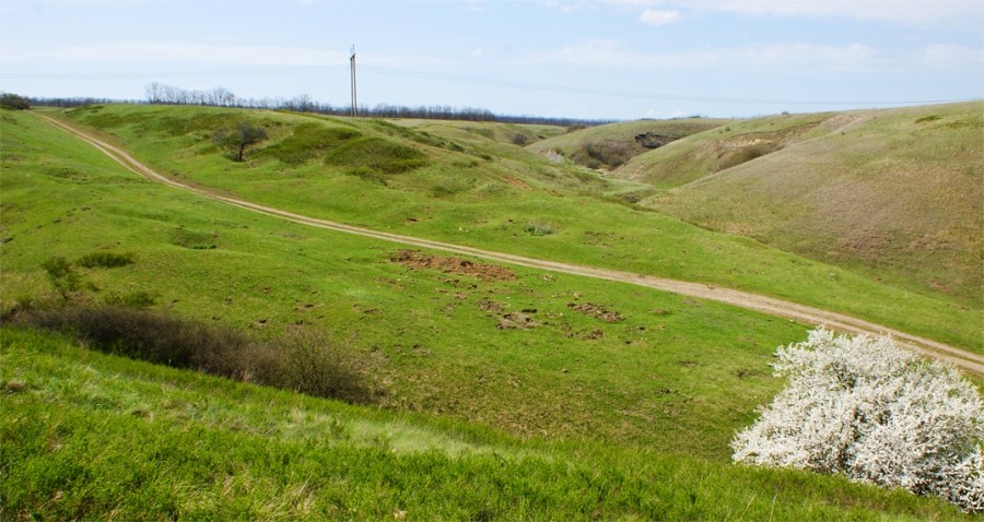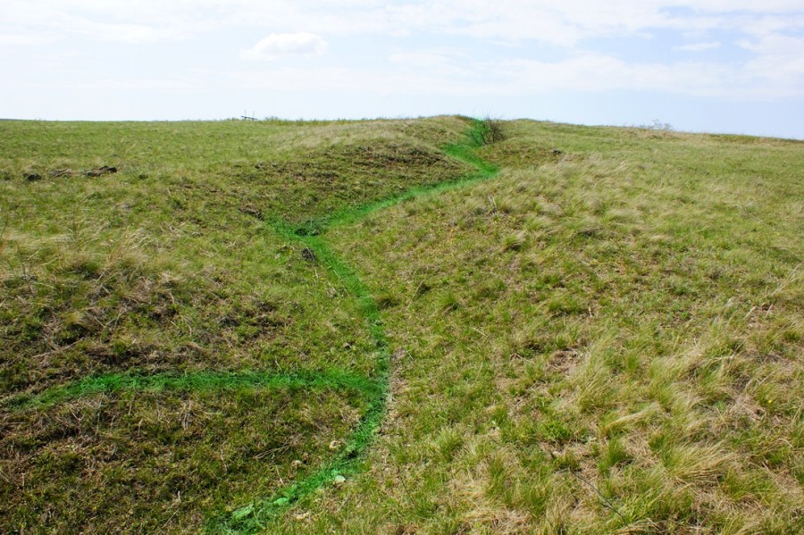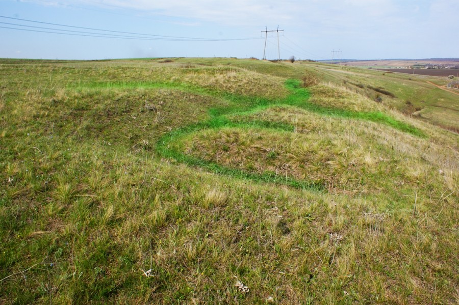 Иногда они расположены на самомой вершине холмов. Иногда прячутся на склоне. Иногда отступают в боковые отроги гиганской долины Тузлова. Здесь и далее, я оттенил дно окопов, так как рассмотреть их трудно даже стоя рядом.